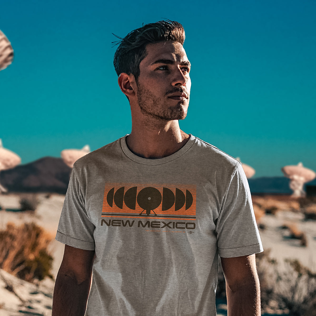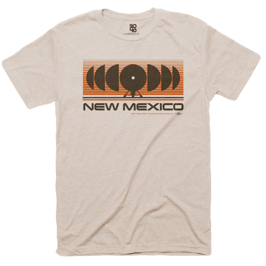 An homage to the desert’s window to the cosmos. The VLA tee celebrates New Mexico’s massive radio telescopes—an Earthbound ear listening to whispers from the distant universe.
